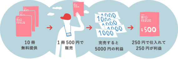 定価500円の雑誌『ビッグイシュー日本版』をホームレスである販売者が路上で売り、250円が彼らの収入になります。最初の10冊は無料で提供し、その売り上げ(5,000円)を元手に、以降は1冊250円で仕入れていただく仕組みです。