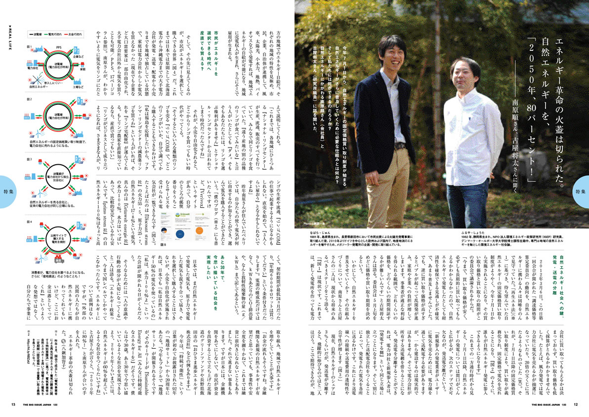 7月1日から自然エネルギーの固定価格買い取り制度が施行され、その価格などは5月上旬に決まる。これで、福島第一原発の事故以来初めて、自然エネルギー転換への具体的な第一歩が踏み出されることになった。この動きをさらに加速する鍵は、風力、太陽光、小水力、バイオマスなどの自然エネルギー発電を、過疎地も含めた地域おこしのための事業や人々の雇用の場として使っていくことではないか。また、電力を消費する市民が電力を選択して購入できる仕組みも必要だ。そこで、自然エネルギーにかかわる若い人たちに、発送配電分離、地域独占の廃止、電力市場の自由化など、その推進の仕組みを提案してもらった。また、これまで自然エネルギー推進を地域で担ってきた先達にその経験を、さらに、新しく事業に取り組み始めた若い人たちに、これからの展望を聞いた。