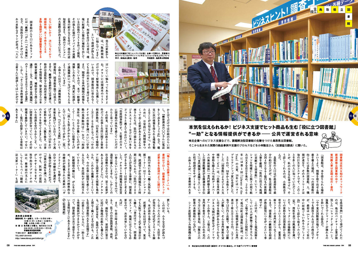 地元企業の商品開発の支援などで課題解決型図書館への先駆者「鳥取県立図書館」のやる気。「まちとしょテラソ」(長野県小布施町)は赤ちゃんからお年寄りまでリラックスできる居場所。青少年の専用スペースもあり、"ここに住みたい"といわせる「武蔵野プレイス」(東京)、市民が参加し年200回以上のイベントを開く「伊丹市立図書館 ことば蔵」(兵庫)。震災直後から6万人以上が利用した「走れ 東北! 移動図書館プロジェクト」(シャンティ国際ボランティア会)。そして、吉田右子さん(筑波大学大学院教授)と和気尚美さん(博士後期課程)には北欧の図書館の活躍について聞いた。